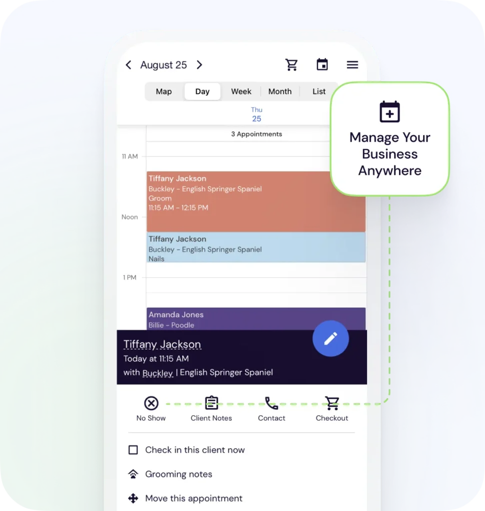 Manage your business from the palm of your hand with DaySmart’s mobile grooming software. Easily view, add, or edit appointments and track information like grooming, personality, and medical notes. Automated text and email reminders reduce client no-shows and loss of revenue for your business.