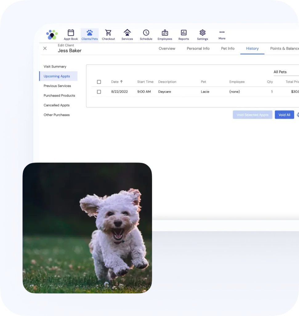 With so many dogs in your care, it’s impossible to remember every little detail. Our cloud-based pet management software allows you to store detailed client records and upload photos, forms, emergency contact information, behavior & allergy notes, and more to build client trust and make your day-to-day a whole lot easier.