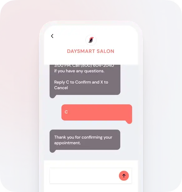 Keep your schedule on track and allow clients to reply via text to confirm or cancel their appointments. Messages will request a reply for “C” to confirm, and you can also allow them to respond “X” to cancel.