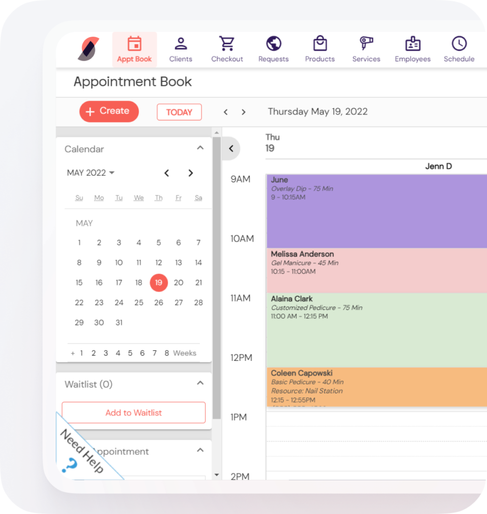 View your day at-a-glance with color-coded services and individualized schedules and service times. Designate employee access levels and allow team members to view schedules online and through the mobile app. Fill in last-minute openings with clients on your waitlist to keep your business thriving.