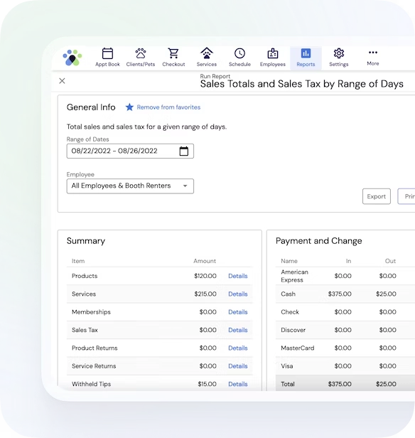 Eliminate tedious accounting tasks at the end of your workday with the Sales Totals and Tax Report options.