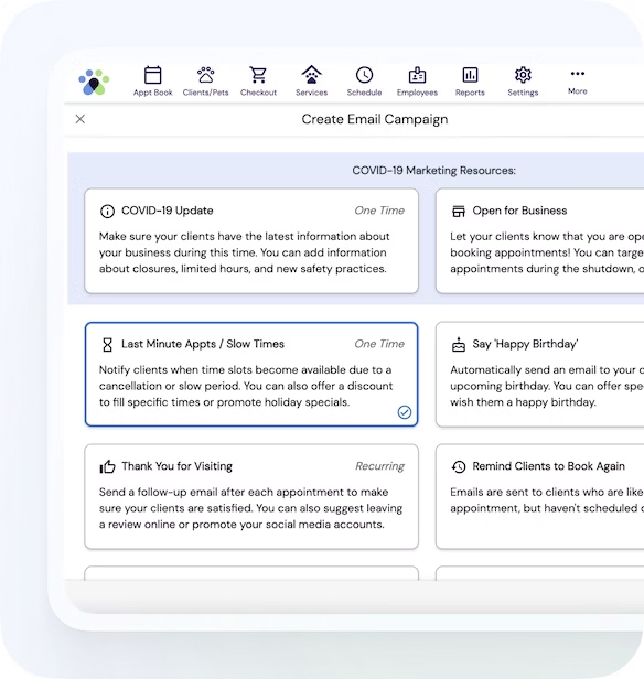 Promote your pet care business with targeted emails that get more clients to open, click, and book appointments.