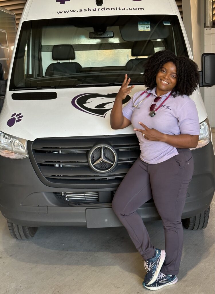 That’s when she decided to take her practice on the road! Dr. Donita’s Veterinary Concierge Services is a fully mobile practice that initially opened in August of 2021 and expanded to a full-service Mercedes Benz sprinter van in March of 2022.