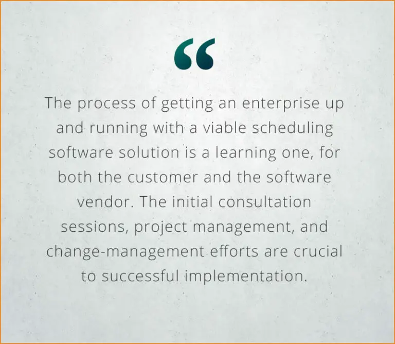 The process of getting an enterprise up and running with a viable scheduling software solution is a learning one, for both the customer and the software vendor. The path to success can be full of potholes, curves, wrong turns, and eventual dead-ends if not approached carefully. The initial consultation sessions, project management, and change-management efforts are crucial to successful implementation.