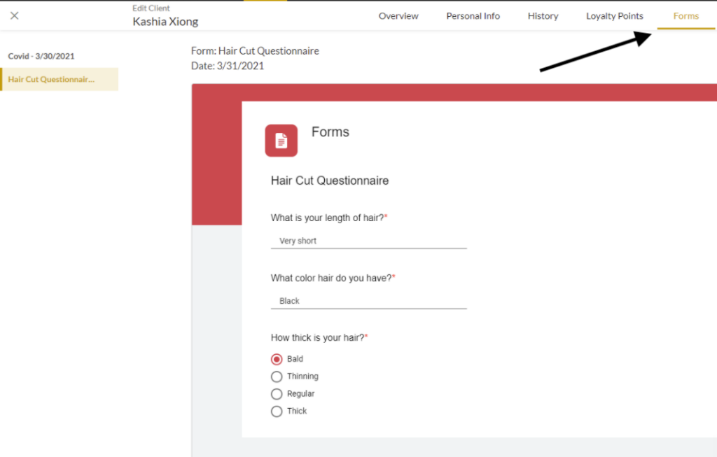 When selecting a client record, you’ll now be able to see a new “Forms” tab. From this tab, you’ll be able to view a snapshot of all completed forms by individual clients.