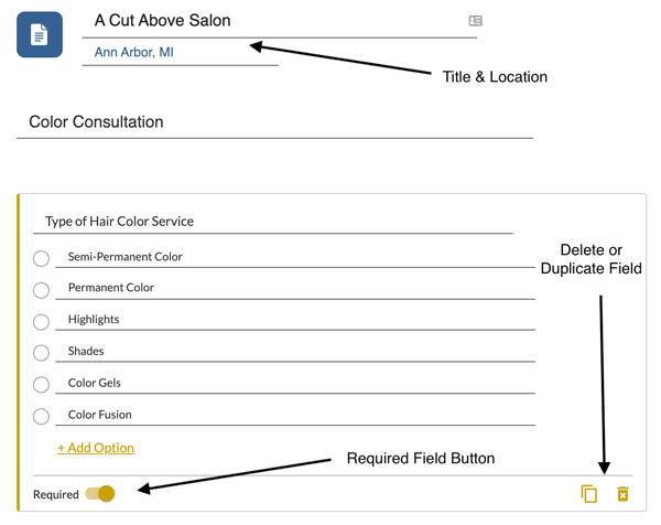 Decide which fields need to be completed by the client and which fields are optional by toggling the ‘Required’ button. Making fields required will ensure clients can’t submit the form until the question is completed. You can also delete and duplicate fields easily by using the buttons located to the right of the ‘Required’ toggle.