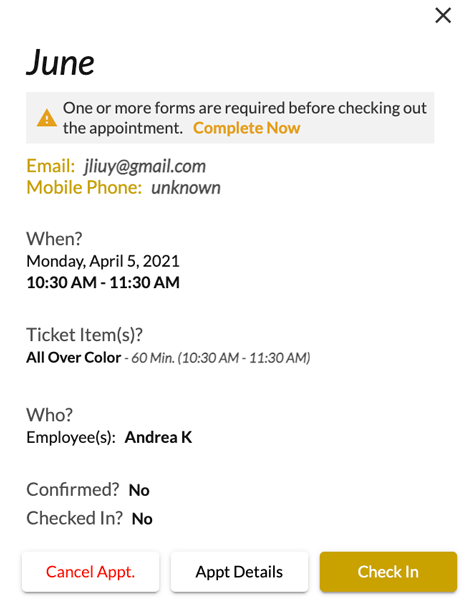 When a service is booked or when viewing an appointment that requires a completed form, a notification will appear with a “Complete Now” link to alert you to send the required forms to the client.