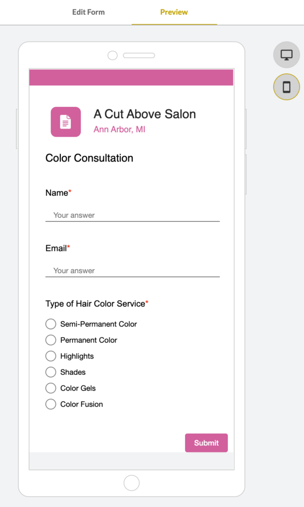 Once your form is all set with the correct fields, color theme, and format, you can then go ahead and preview your newly created form for desktop and mobile. Interact with the form as your client would, to ensure everything is working as expected before activating and sending.