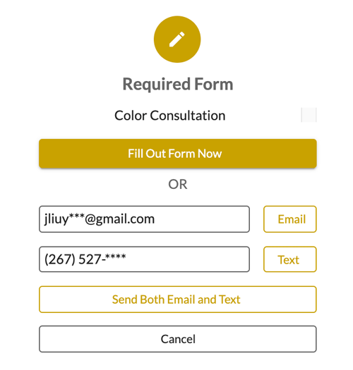 Clicking the “Complete Now” button will open another box where you can either fill in the form now (if the client is at your business and didn’t complete the form prior to their appointment), or send the required form to the client via text, email, or both.