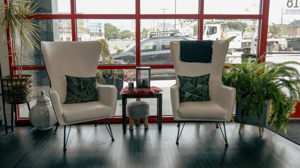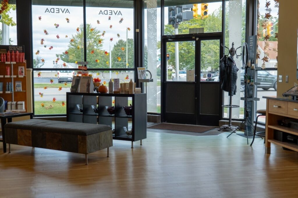 Angela decided to name her salon Sakora, which is derived from the Japanese word Sakura meaning cherry blossom, the state tree of Michigan. This meaning is significant because it complements the natural products they support as an Aveda Concept salon. They offer a wide variety of services, from hair color, hair cutting, extensions, facial services, massage, nails, and much more. Clients will find repurposed materials (front desk, retail shelving, waiting chairs) within the salon that complement the Aveda mission.