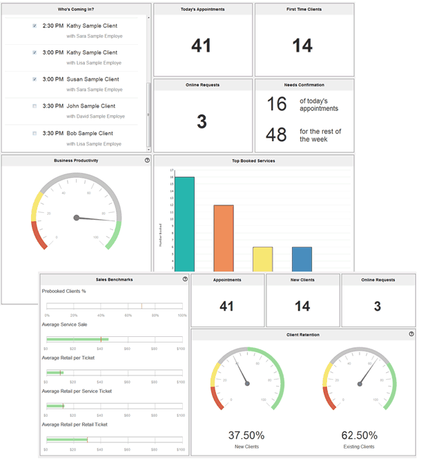 Your Day at a Glance. Your upcoming day is clearly represented in our new Dashboard, complete with Productivity Meter, Upcoming Appointments, and more. Get to know your First Time Clients and track who is Due for Checkout.