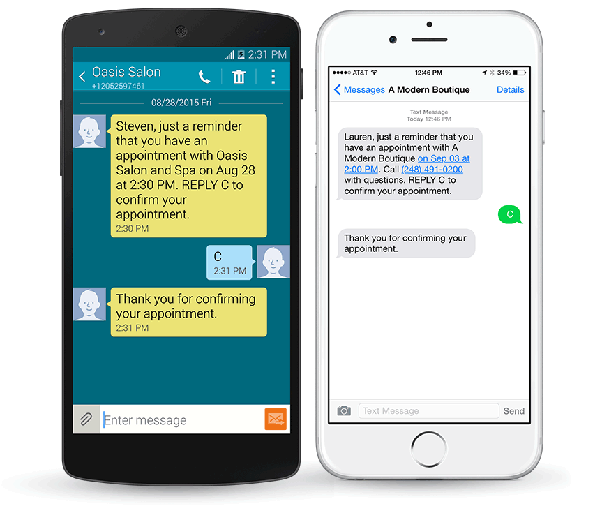 Text Appointment Confirmations. Cut down on no-shows with the new completely automated text message confirmations. Clients can now reply to their SMS reminder to confirm their appointment, which updates your schedule in real time.
