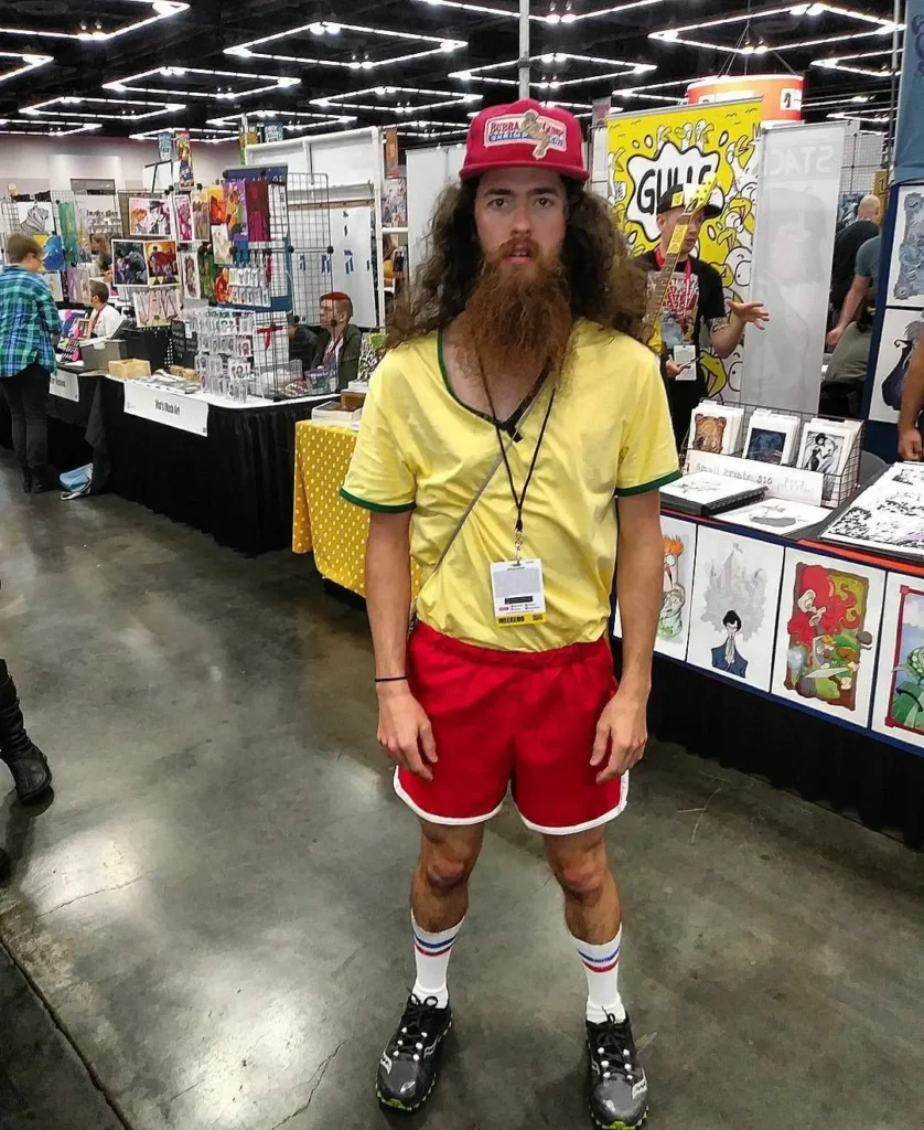 One of these ‘tasks’ was running. This costume is a take on Forrest during his “running across the USA” era. Any tracksuit will do, provided you have the Bubba Gump hat. It’s the curly long hair and beard you’ve really got to nail!