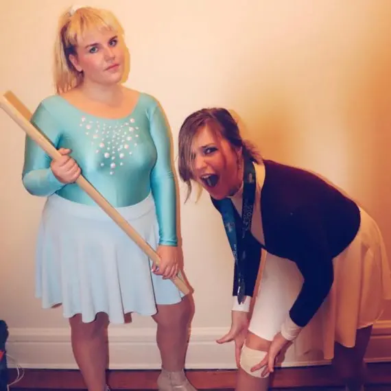 The Tonya look is easily achieved with a light blue or pink skater’s leotard, but isn’t truly complete without the signature blonde bangs and high ponytail.