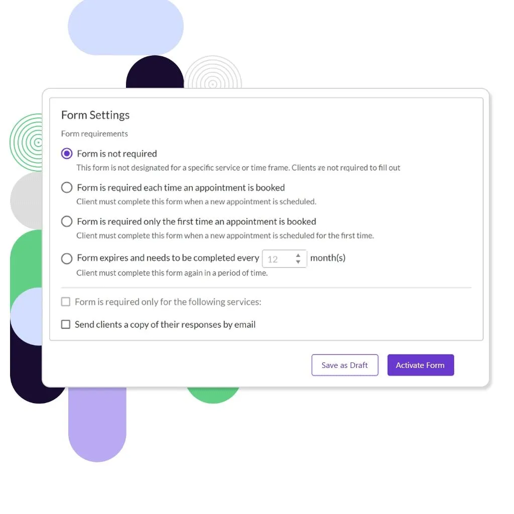 Form built and ready to send? Set up form requirements and integrate them with your client records and services. For each form created, you can select from the following options: