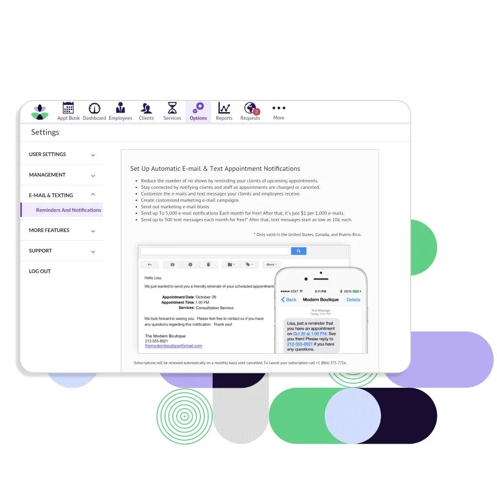 - Choose whether you would like clients/employees to receive text, emails, or both!