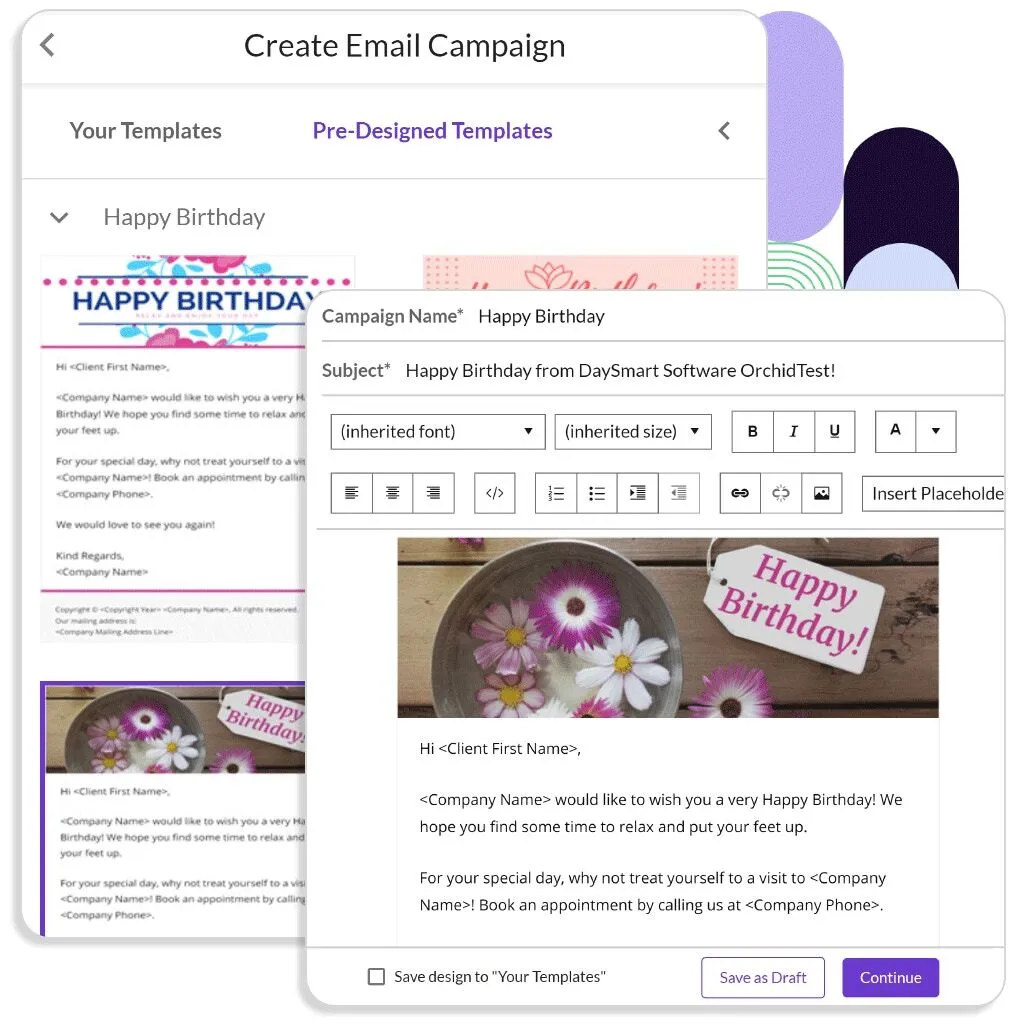 DaySmart Spa comes complete with an entire library of professionally made email templates so you can quickly and easily promote your business, and increase your revenue! Automatically set up ‘Happy Birthday’, ‘Thank You For Visiting’, and ‘We Miss You’ campaigns that are ready to deploy with a few simple clicks.